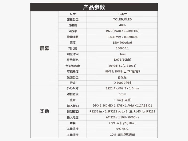 4、顯著的透明度:OLED透明屏的透明度非常高,可以達(dá)到70%以上的透明度,這使得它能夠在透明表面上顯示圖像和文字,同時(shí)不會(huì)遮蓋背景。OLED透明屏還具有更好的自發(fā)光特性,可以實(shí)現(xiàn)更高的亮度,并消除了傳統(tǒng)液晶屏的泄漏問題。