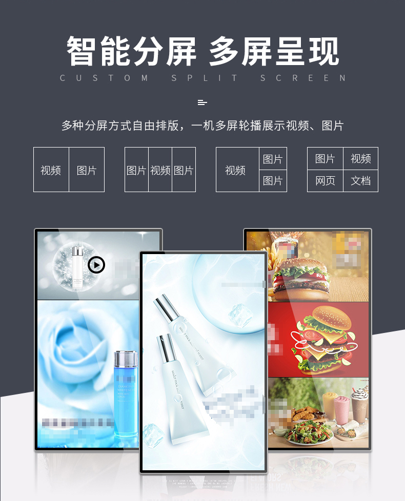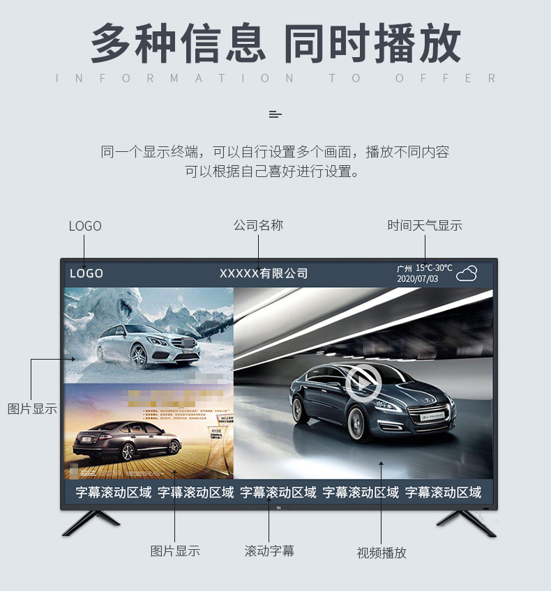 分屏顯示:同時(shí)播放音視頻、圖片、字母等多種信息組合,實(shí)現(xiàn)是視頻、圖片、字幕的任意位置自由調(diào)整,解決了僅放廣告關(guān)注度降低或僅放娛樂節(jié)目沒有廣告價(jià)值的矛盾。