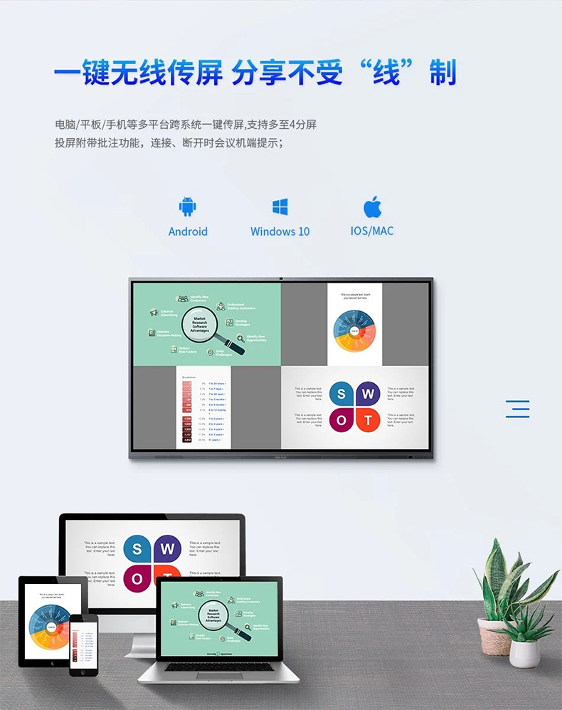 智能會議一體機(jī)集成了電腦、電視、音響等多設(shè)備功能于一體,配備了電子白板書寫、無線投屏、智能批注、遠(yuǎn)程會議等多種會議常用工具,可以流暢播放ppt、word、excel、flash等文件,還配置了落地式移動(dòng)支架,方便隨時(shí)移動(dòng)。