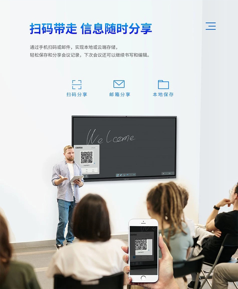 硬件設(shè)備自帶高清攝像頭,內(nèi)置安裝了遠(yuǎn)程視頻會議系統(tǒng),可以方便實(shí)現(xiàn)視頻音頻交流,加上書寫黑板共享功能,方便參會人員互動(dòng)交流,就如同面對面開會一樣。使用具有高度人機(jī)交互功能的智能會議一體機(jī),不僅僅能給人一種非常高大上的感覺,在會議作用上可以充分調(diào)動(dòng)參會人員的熱情和溝通欲望,從而提高會議效率,提高會議質(zhì)量。