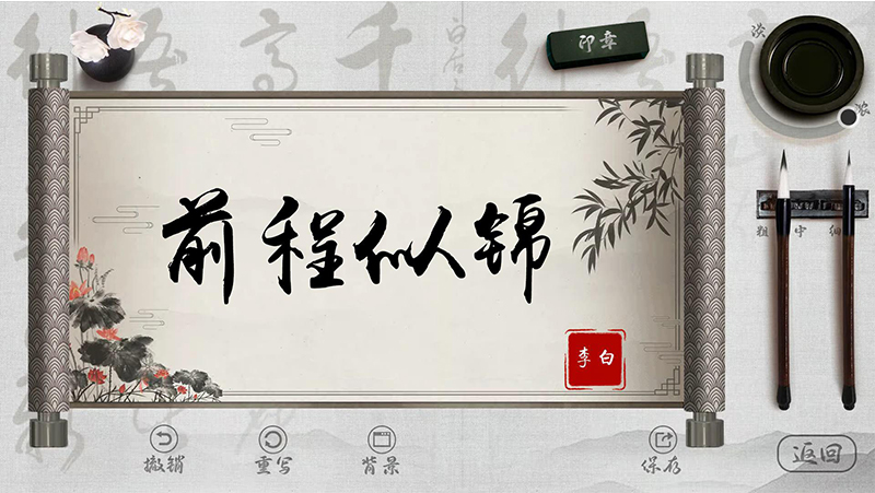 4、毛筆書寫:支持調(diào)整畫筆粗細(xì)及筆墨濃淡程度、支持撤銷、重寫、保存,支持書寫背景更換