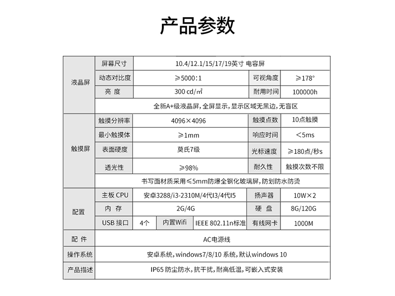 產品概述: 工控一體機又名工業(yè)控制計算機,是專門為工業(yè)控制設計的計算機,憑借著其輕薄精巧的外觀,簡單的操作,強大的功能,在行業(yè)中占據著不可或缺的位置。全鋁結構,被動散熱,無風扇設計,支持安裝X86/安桌/顯示器主板,前面板支持IP65等級防護,安裝結構兼容桌面式、壁掛式、嵌入式。 產品特點: 多種高清分辨率可選,擁有100%sRGB色域,還原真實色彩; IPS高清屏,178°超廣視角,每一個角度都可以完美呈現(xiàn); 有效過濾380-445nm波段的藍光,長時間觀看不累眼,守護眼睛; 使用高強度工業(yè)級邊框,穩(wěn)固結實,放撞放刮,惡劣環(huán)境可使用; IP65級防塵防水,耐高低溫,-10°C~70°C皆可正常運行,擁有超強抗干擾能力; 工業(yè)級應用,全年24小時持續(xù)運行,使用穩(wěn)定且耗能低; 十指觸控,手指點擊屏幕快速響應,多種快捷手勢等你探索; 外嵌式安裝,靈活應用于多種場景,增加了使用的便捷性;