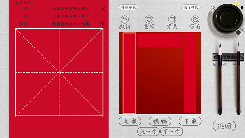 1、功能默認(rèn)首先書寫上聯(lián)的內(nèi)容,左邊的上聯(lián)會(huì)有一個(gè)黃色的框體閃爍,可以在左邊區(qū)域的白色田字格中書寫上聯(lián)的具體內(nèi)容,寫完一個(gè)字后通過點(diǎn)擊下一個(gè)按鈕 繼續(xù)在左邊的田字格中書寫楹聯(lián)的內(nèi)容,通過點(diǎn)擊上一聯(lián)和下一聯(lián)以及橫幅 按鈕切換決定 使用者書寫內(nèi)容是上聯(lián)內(nèi)內(nèi)容還是下聯(lián)或者橫幅內(nèi)容。