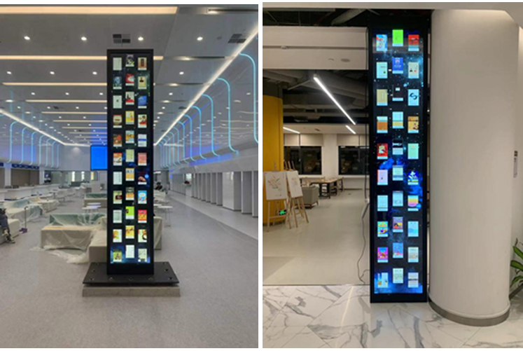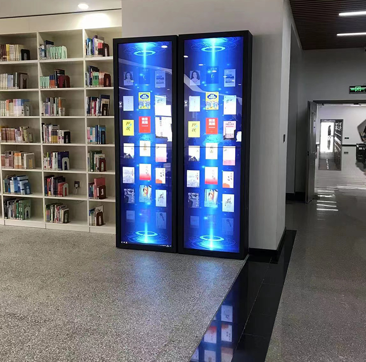 展示效果:將傳統(tǒng)紙質(zhì)圖書(shū)以數(shù)字的形式展示,電子圖書(shū)以瀑布流的形式從頂端向下飄落,觸碰圖書(shū)封面,即可打開(kāi)圖書(shū)詳情頁(yè),支持在線閱讀,通過(guò)掃描二維碼的方式借閱該書(shū),每塊拼接屏的圖書(shū)隨機(jī)排序